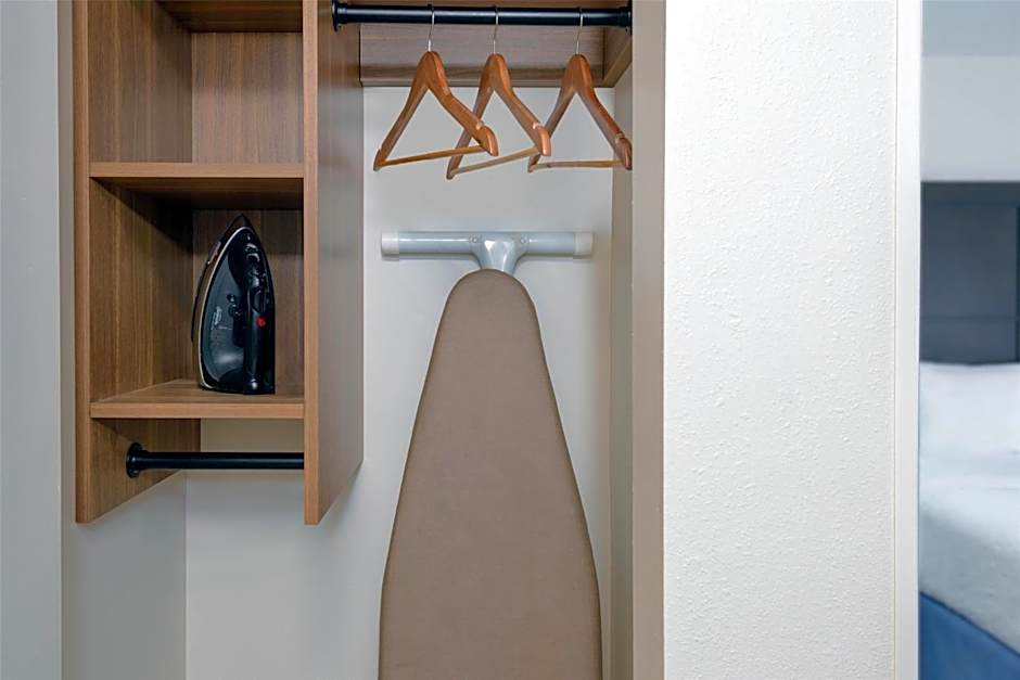 This room features an accessible bath tub and visual alarm notification devices. A 32-inch flat-screen TV, coffee machine desk, hairdryer, and ironing facilities are included.